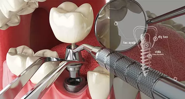 Çeşitli nedenlerle kaybedilen ve fonksiyon eksikliğine sebep olan dişlerin yerine konulacak yapay diş köklerine implant adı verilmektedir. Bu yapay diş kökleri titanyum alaşımdan yapılmış vidalardır. İmplantın temel görevi eksik diş kökünün yerini alır ve kaybedilen ağız ve diş fonksiyonunun işlevini tekrar kazandırır. Bu sayede kemik dokusuna zarar verilmeden doğal bir diş gibi kullanılabilecek implantlı diş elde edilir.